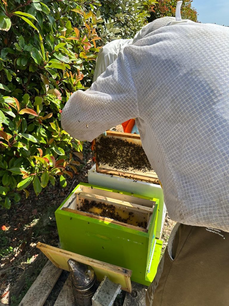 Une hausse a été ajoutée sur les 2 dernieres ruches ONB.. Apres constat que le abeilles ne montaient pas (hausse et cadres neufs , nous avons intercalé des anciens cadre batis des hausses de Jérome.. En esperant les attirer
