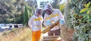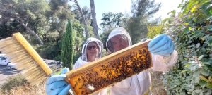 4 mois après l’implantation des 3 essaims sur la butte de l ‘office, nous avons procédé à la récolte de la première hausse en présence d’une collègue de l\’Office .