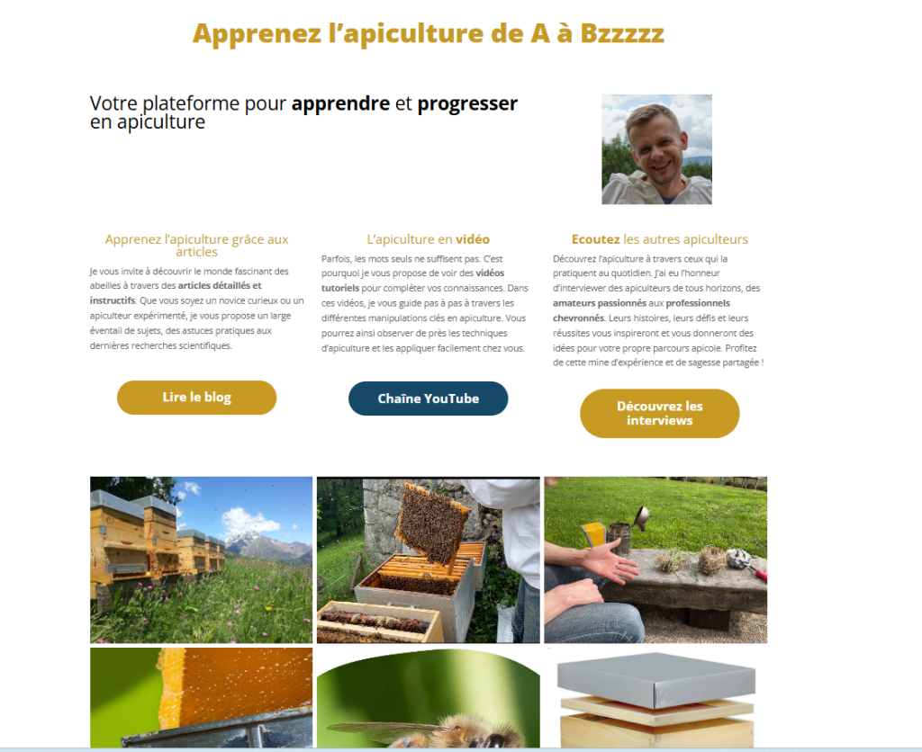 Apprenez l’apiculture de A à Bzzzzz Votre plateforme pour apprendre et progresser en apiculture Ce site de formation animé par Guillaume est topo On suit un cursus intuitif très complet et Guillaume répond à nos questions avec beaucoup de pédagogie